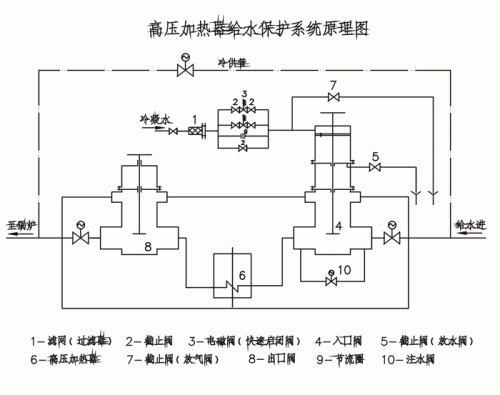 系统正常工作时,关闭旁路阀门,打开高加进、出口阀,给水通过高压加热器至锅炉,当高加出现故障时,打开旁通阀,关闭高加进、出口阀,使高加解列,给水经旁路直接进入锅炉,完成对高加保护。